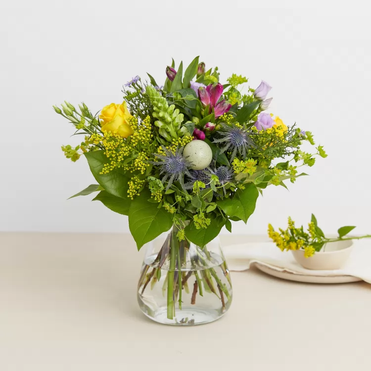 Et smukt “påskeæg” kunne bestå af disse skønne påskeblomster i lilla og gule nuancer. Blomsterne kan variere efter sortimentet hos den enkelte florist. Vase og den øvrige dekoration medfølger ikke.