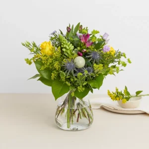 En unik høj påskebuket og fyldte kvalitetschokolader vil med garanti glæde modtageren. Blomsterne kan variere alt efter sortimentet hos den enkelte florist. Ekskl. vase.