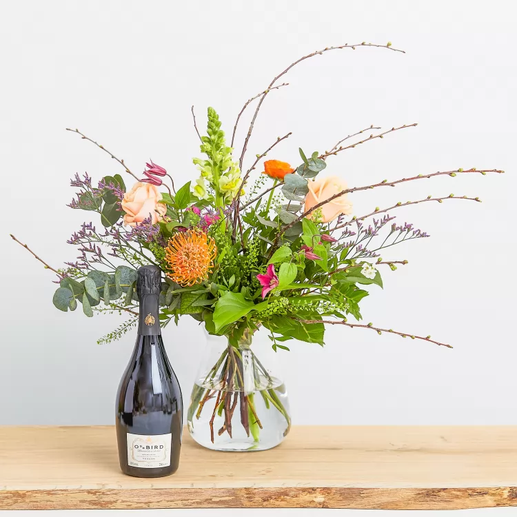 Ønsk modtager god påske med en smuk buket og alkoholfri Spumante. Blomsterne kan variere alt efter sortiment hos den enkelte florist. Ekskl. vase