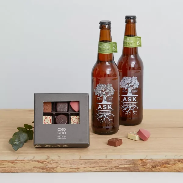 To flasker ASK Paaskeurt er kommet i selskab med en æske Cho Cho 9 stk.  En dejlig forårshilsen til værten eller værtinden.