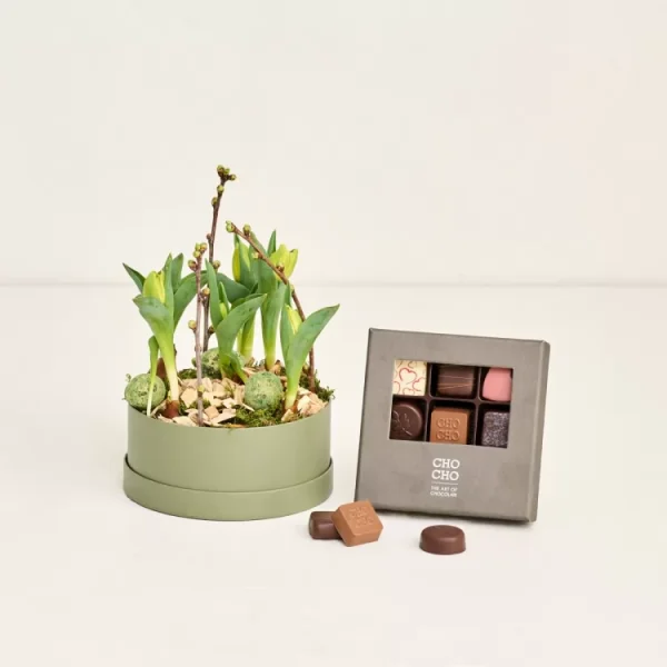Babytulipaner i forårs farver ledsaget af kvalitetschokolade fra CHO CHO – en forårskombination perfekt som gave til vært og værtinden eller blot til at forkæle dig selv. Floristen sammensætter æsken med mos, dekorationsvagtelæg og kirsebærgrene. Pynt og æskens farve kan dog variere efter sortiment hos den enkelte florist. Æsken måler 15 cm i diameter. Tulipanerne må ikke forventes udsprungne ved levering.