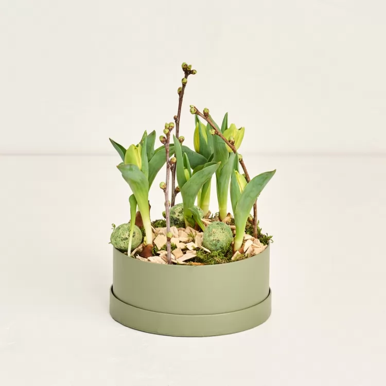 Denne sammenplantning med små tulipaner vil bringe forårets lys og farver indenfor. Floristen sammensætter æsken med mos, dekorationsvagtelæg og kirsebærgrene. Pynt og æskens farve kan dog variere efter sortiment hos den enkelte florist. Æsken måler 15 cm i diameter. Tulipanerne må ikke forventes udsprungne ved levering.
