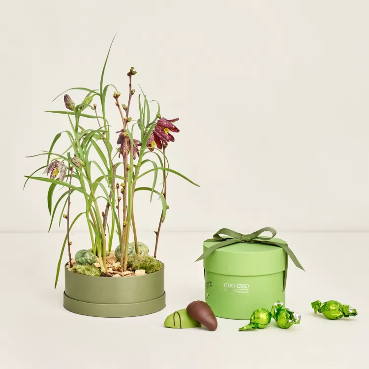 Denne blomsterdekoration med forårschokolade fra CHO CHO vil være en unik gave eller ren selvforkælelse. Floristen vil sammensætte æsken med de flotte vibeæg, mos og dekorationsvagtelæg. Æskens farve og pynt kan variere efter sortiment hos den enkelte florist. Æsken måler 15 cm i diameter.