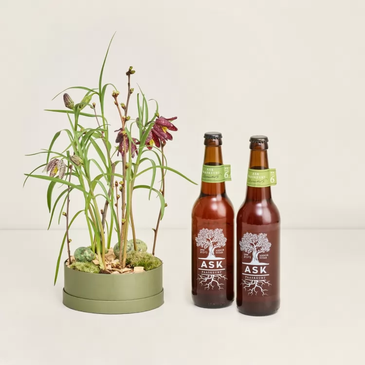 Et blomsterarrangement med vibeæg, dekorationsvagtelæg og mos kombineret med 2 stk. ASK øl. Æskens farve og pynt kan variere efter sortiment hos den enkelte florist. Æsken måler: Lille: 15 cm i diameter. Stor: 19 cm i diameter. Vibeæg må ikke forventes udsprungne ved levering.