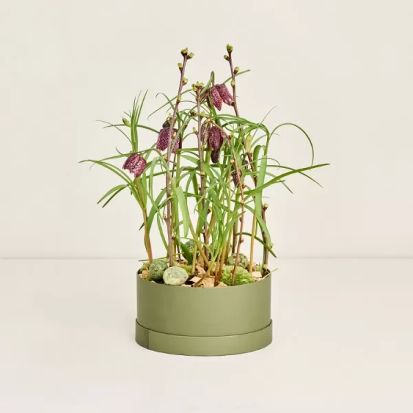 Sæt et unikt præg på hjemmet med denne sammenplantning med vibeæg i æske. Floristen vil sammensætte blomsteræsken med dekorationsvagtelæg og mos. Æskens farve og pynt kan variere efter sortiment hos den enkelte florist. Æsken måler: Lille: 15 cm i diameter. Stor: 19 cm i diameter. Vibeæg må ikke forventes udsprungne ved levering.