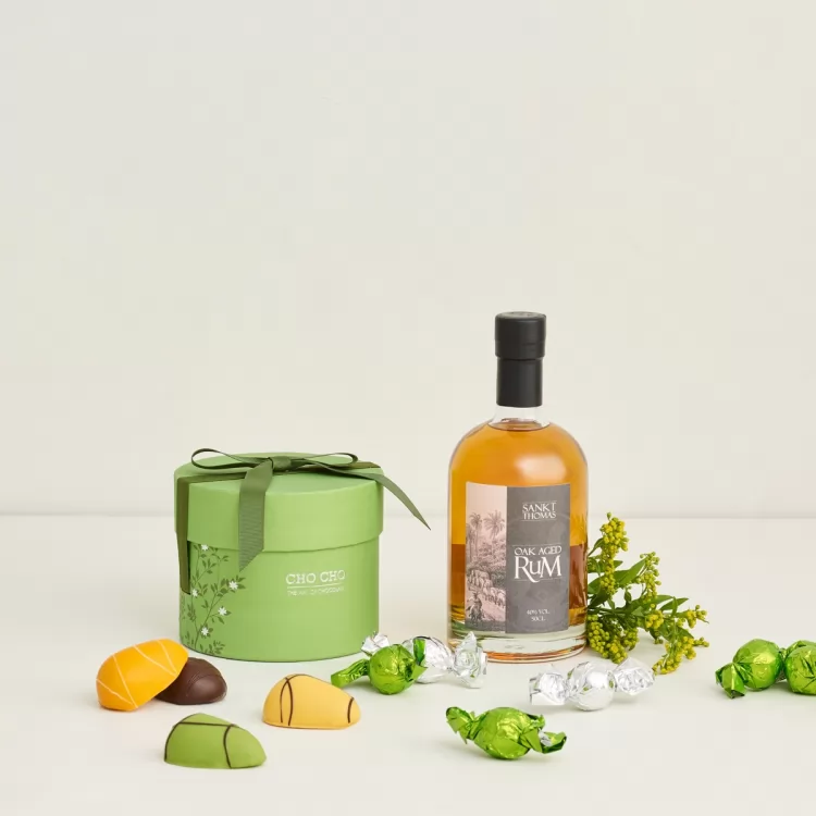 Overrask modtageren med en kombination af chokolade og en flaske Sankt Thomas Rom. En rom med en blød, fyldig og aromatisk smag, perfekt til at nyde sammen med en lækker bid chokolade.